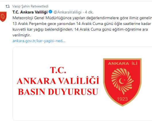 Ankara Valisi Vasip Şahin, Ankara'da yarın, yani 14 Aralık 2018 Cuma günü okulların tatil ilan edildiğini açıkladı.