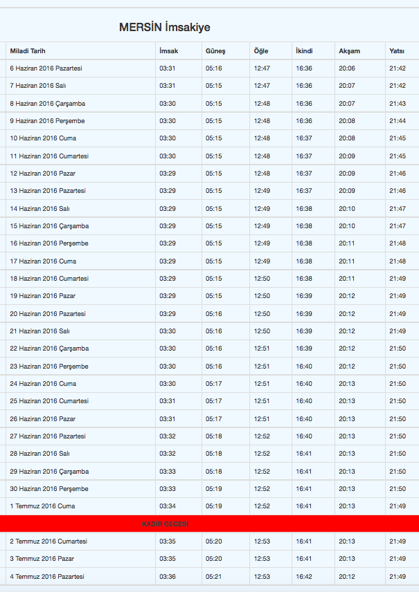 MERSİN iftar vakitleri ve sahur saatleri Diyanet İmsakiye 2016 takvimi ile gün gün listelerdi. Mersin İmsakiye'ye göre iftar vakitleri ile birlikte ezan saatlerini de bulacaksınız.