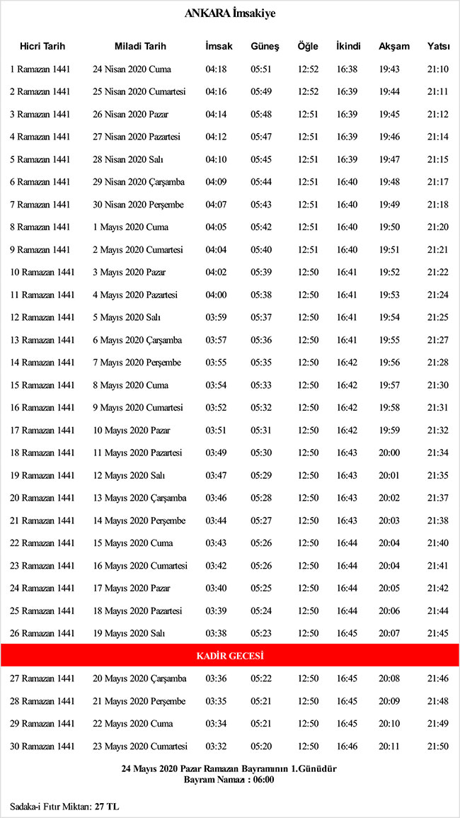2020 Ramazan geldi çok şükür. Ankaralılar da tüm Türkiye gibi 24 Nisan 2020 Cuma sabahı sahur için ayakta olacak. Oruca niyet edilen vakit olan İmsak Vakti öncesi sahur yapılır.