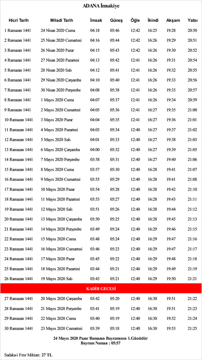 2020 Ramazan geldi çok şükür.Adanalılar da tüm Türkiye gibi 26 Nisan 2020 Pazar sabahı sahur için ayakta olacak. Oruca niyet edilen vakit olan İmsak Vakti öncesi sahur yapılır.