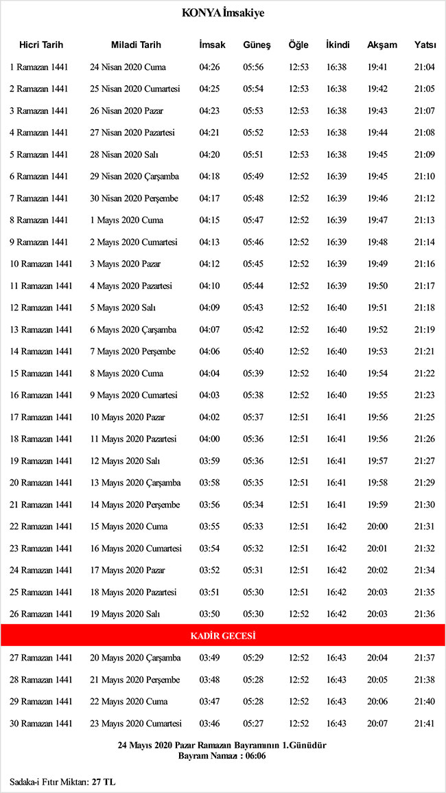 2020 Ramazan geldi çok şükür. Konyalılar da tüm Türkiye gibi 27 Nisan 2020 Pazartesi sabahı sahur için ayakta olacak. Oruca niyet edilen vakit olan İmsak Vakti öncesi sahur yapılır.