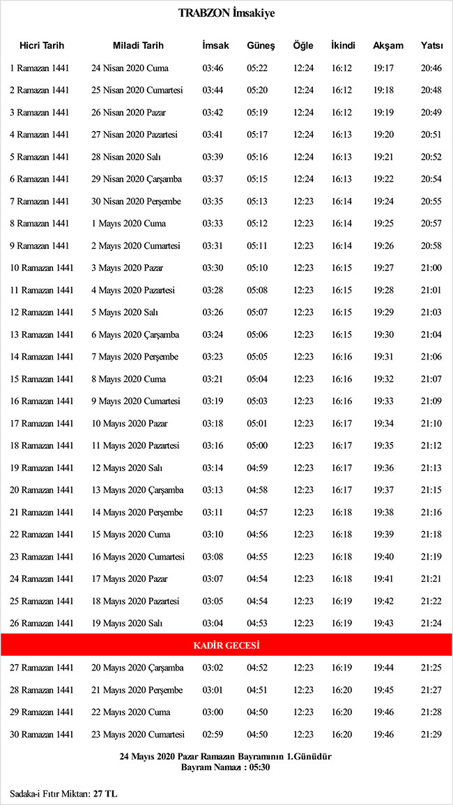 27 Nisan Trabzon İmsak Vakti: 3.41