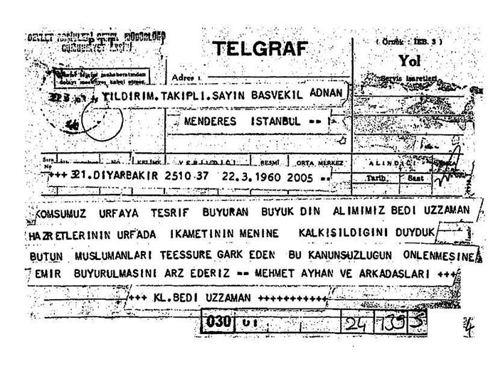 Daha sonra bu emir İçişleri Bakanlığından geldiği için, biz her tarafa, tanıdıklarımıza, çevre illere Maraş’a Ankara’ya, tanıdık bütün Nur talebelerine telefon ediyoruz. İçişleri Bakanlığı “böyle böyle demiş, Üstadımız Urfa’da hastadır rahatsızdır, şimdi yola çıkamaz gelemez gidin Menderes’le veya içişleriyle temasa geçin, müsaade etsinler burada kalsın” diye telgraflar çekiyoruz, telefonlar ediyoruz. Daha sonra oranın Demokrat Parti başkanı Mehmet Hatipoğlu geldi. “Bediüzzaman bizim misafirimizdir, biz onu hiçbir yere veremeyiz. Bizim misafirimiz Allah misafiridir, kimseye vermeyiz” dedi.