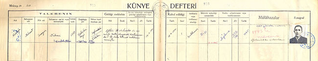Belgede Sungur ağabeyin doğum tarihi, doğduğu yer ve 1945'te mezun olduğu bilgileri ile o döneme ait fotoğrafı bulunuyor.