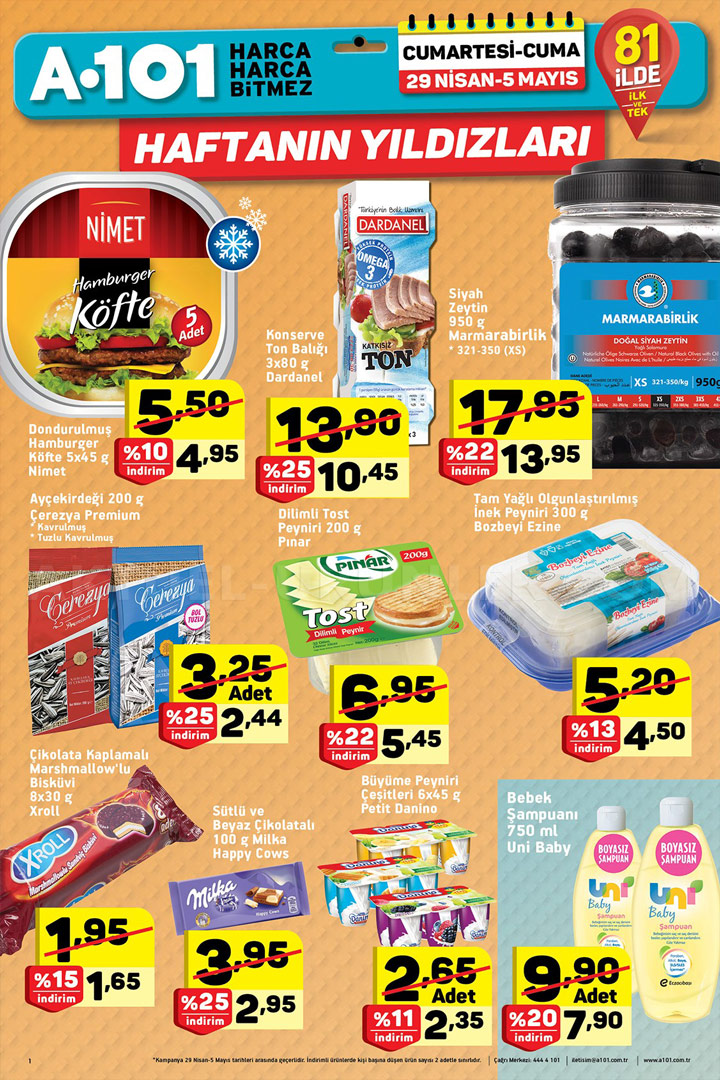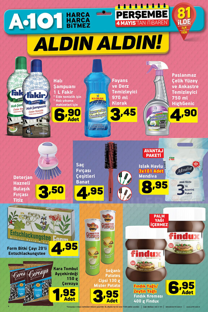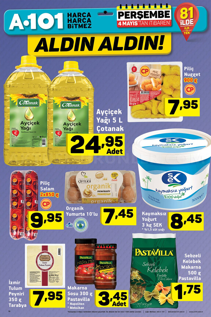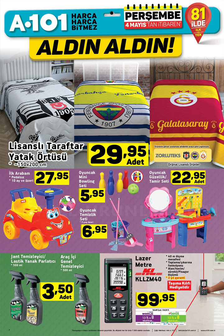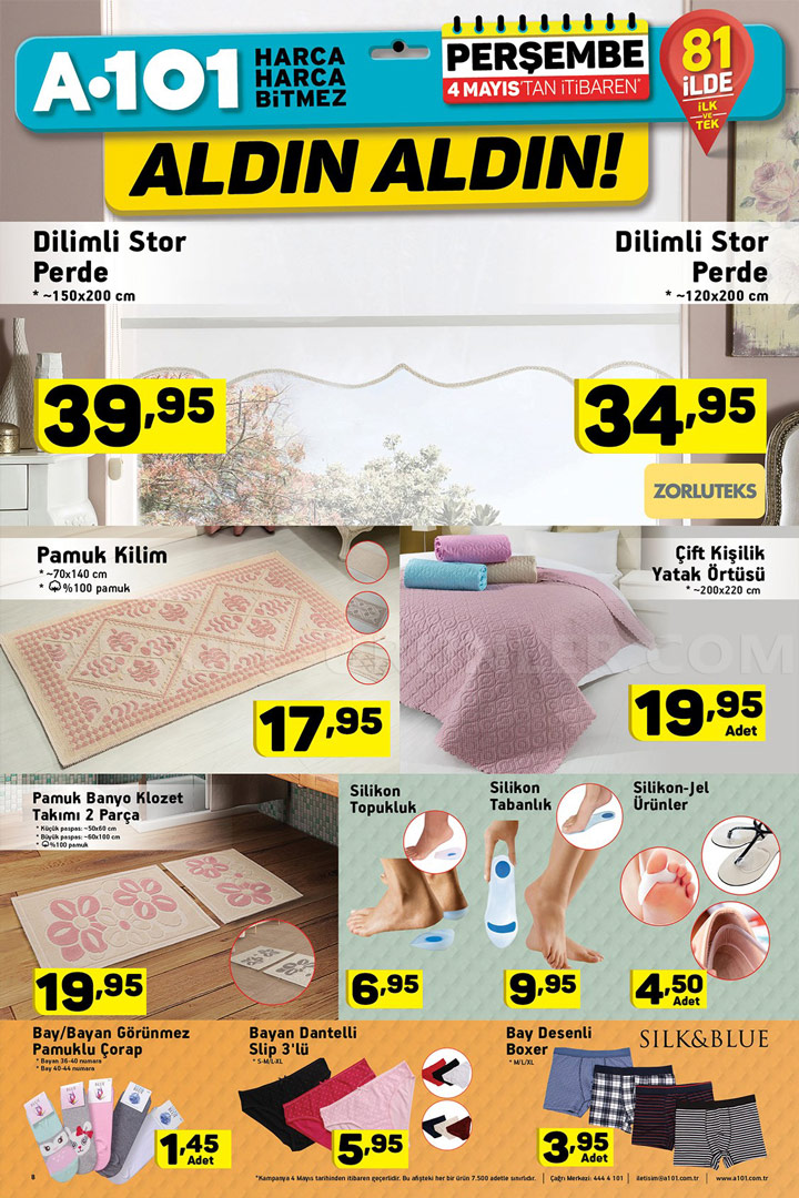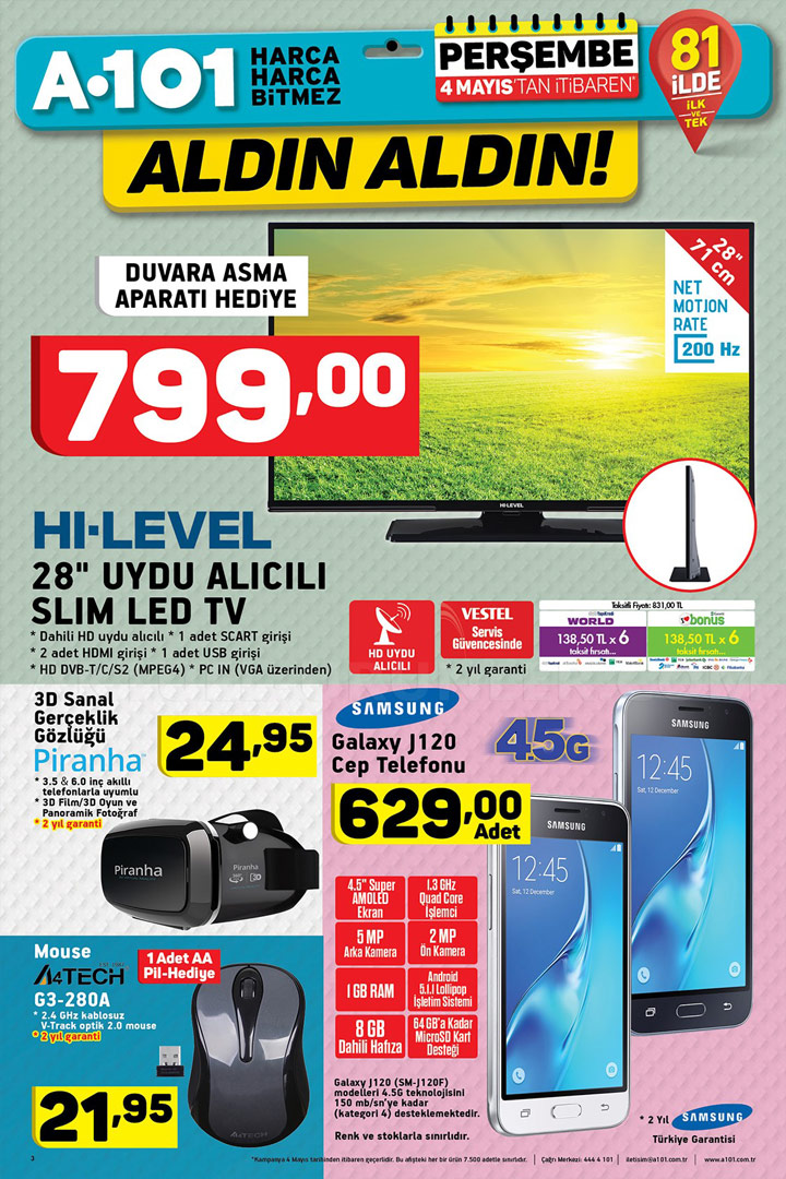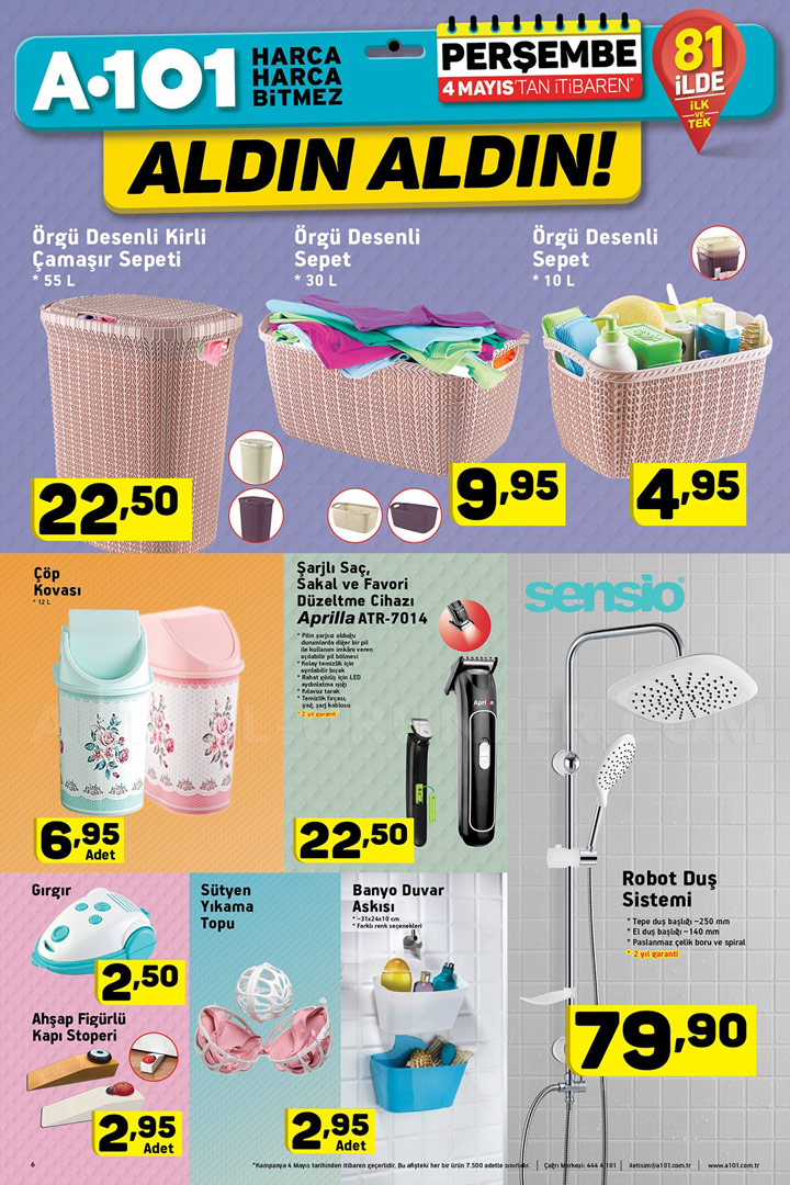 Türkiye'nin pek çok noktasına yayılmış şubeleri ile müşterilerine kaliteli bir hizmeti ilke etmiş marketler zinciridir. Her hafta yayınladığı Aktüel ürünler kataloğu ile müşterilerini fırsatları konusunda bilgilendiren A101, 4 Mayıs Perşembe da yepyeni ürünleri raflarında görücüye çıkarıyor.