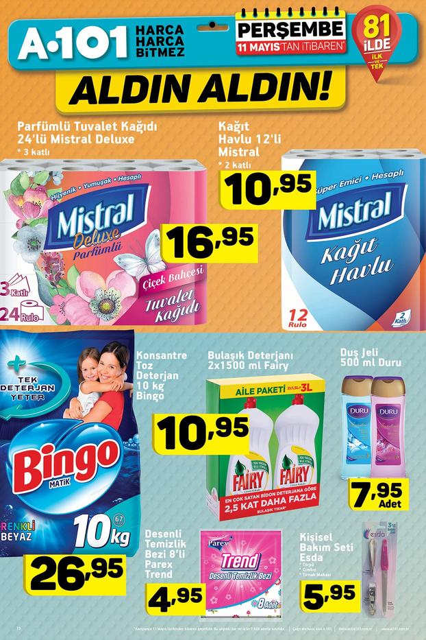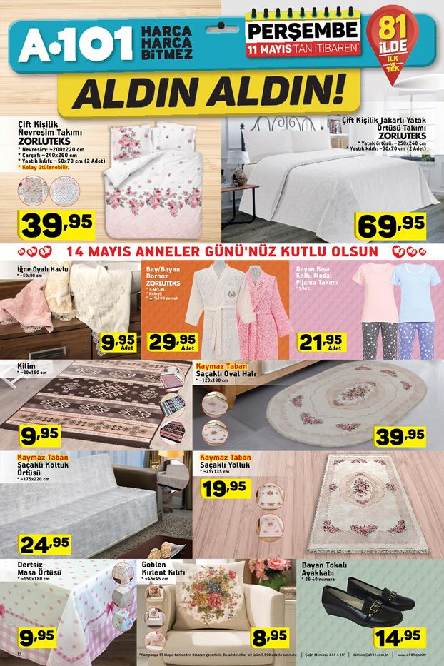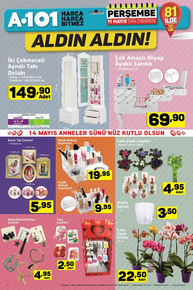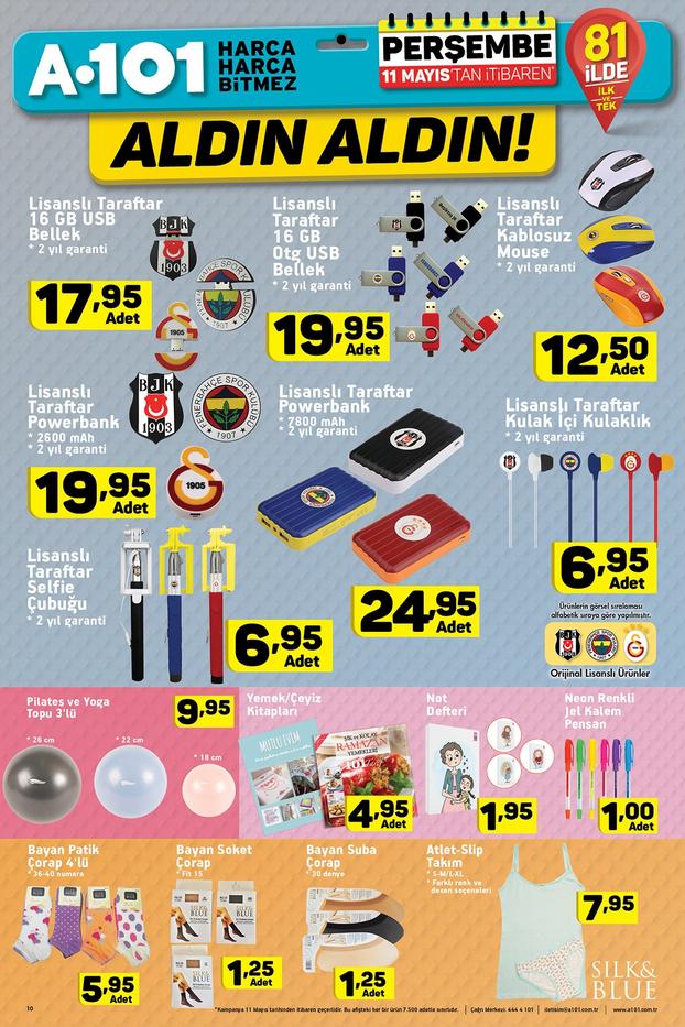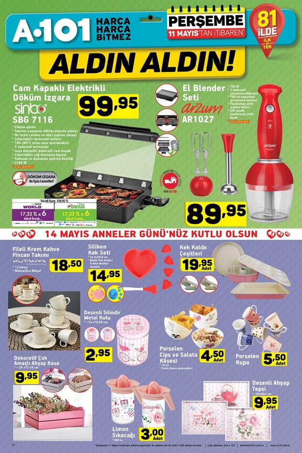 Türkiye'nin pek çok noktasına yayılmış şubeleri ile müşterilerine kaliteli bir hizmeti ilke etmiş marketler zinciridir. Her hafta yayınladığı Aktüel ürünler kataloğu ile müşterilerini fırsatları konusunda bilgilendiren A101, 11 Mayıs Perşembe da yepyeni ürünleri raflarında görücüye çıkarıyor.