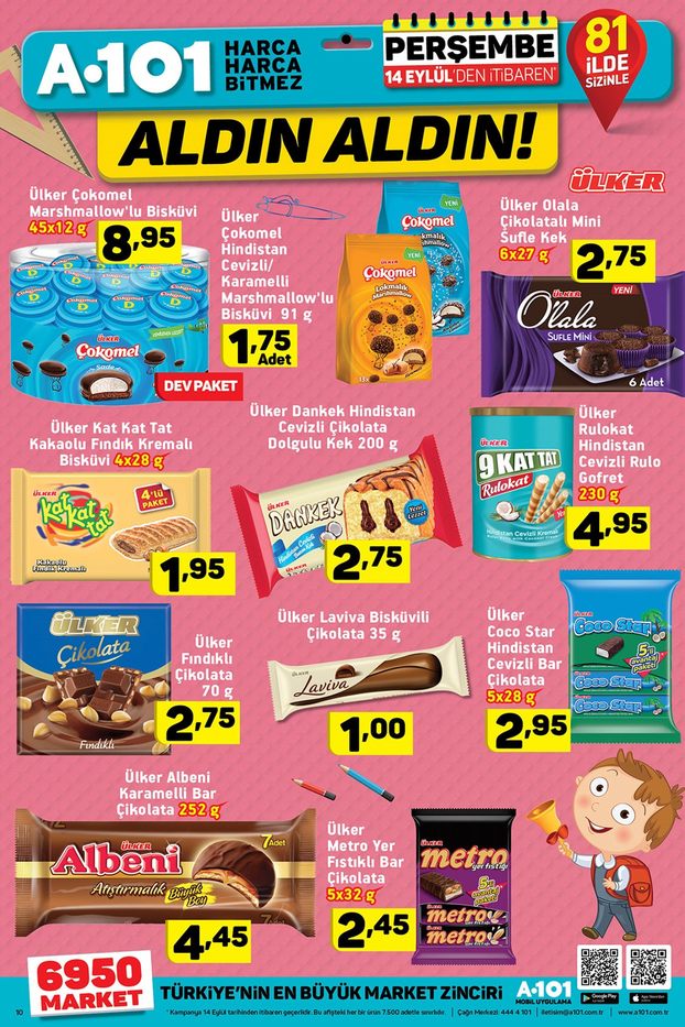 A101, Türkiye'nin pek çok noktasına yayılmış şubeleri ile müşterilerine kaliteli bir hizmeti ilke etmiş marketler zinciridir. Her hafta yayınladığı Aktüel ürünler kataloğu ile müşterilerini fırsatları konusunda bilgilendiren A101, 14 Eylül Perşembe de yepyeni ürünleri raflarında görücüye çıkarıyor.