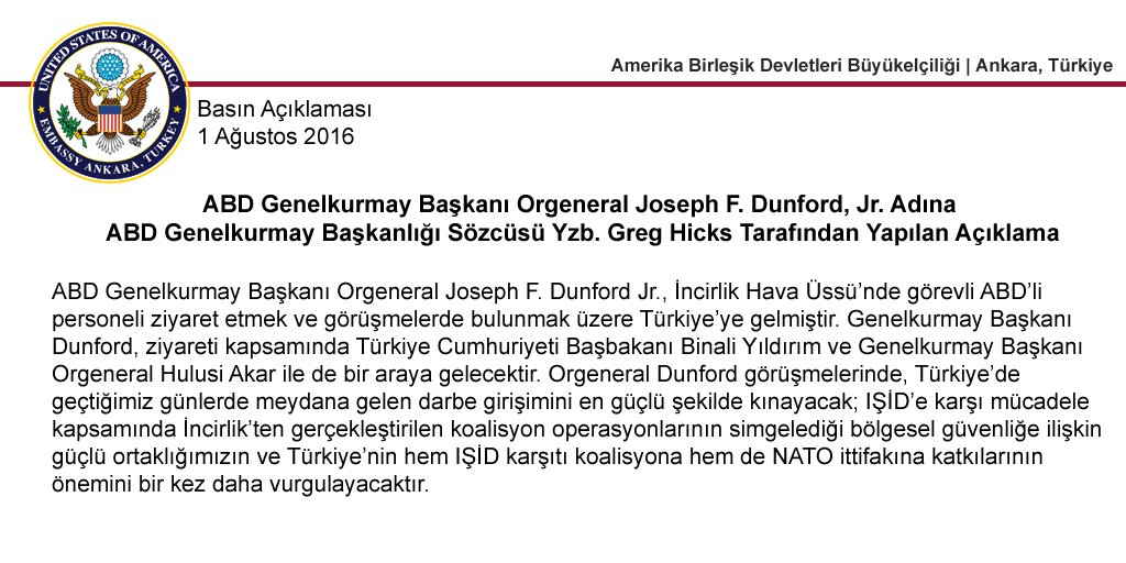 Açıklamada, "Orgeneral Dunford görüşmelerinde, Türkiye’de geçtiğimiz günlerde meydana gelen darbe girişimini en güçlü şekilde kınayacak; DAEŞ’e karşı mücadele kapsamında İncirlik’ten gerçekleştirilen koalisyon operasyonlarının simgelediği bölgesel güvenliğe ilişkin güçlü ortaklığımızın ve Türkiye’nin hem DAEŞ karşıtı koalisyona hem de NATO ittifakına katkılarının önemini bir kez daha vurgulayacaktır" denildi.
