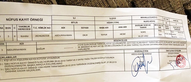 Üstadın evlâd-ı maneviyesi ve ‘biraderzadesi’ olan Abdurrahman Nursi, 1929 yılında vefat ettiği bir çok kayıtta bulunmakla birlikte, Üstadın akrabalarından olan Hikmet Okur vasıtası ile Hizan Nüfus Müdürlüğünden temin ettiğimiz ‘Nüfus Kayıt Örneğine’ göre, vefatı 1931 yılı ve resmi adının Abdurrahman Okur yazıldığı görülmektedir. (Allah rahmet eylesin.) Yine aynı kayda göre bekar olduğu görülecektir.