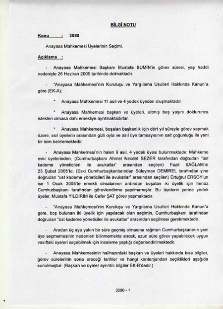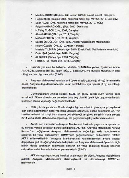 Anayasa Mahkemesi ile ilgili olarak "2007 yılında yapılacak Cumhurbaşkanlığı seçimleri, yine aynı yıl yapılacak olan genel seçimlerden önce Meclis'te çoğunluğu elinde bulunduran AK Parti'nin kendine müzahir bir kişiyi bu makama getirebileceği ve görev süresinin sona ereceği 2014 yılına kadar Mahkemede çoğunluğu ele geçirebileceği kıymetlendirilmektedir" ifadelerinin kullanıldığı bilgi notunda, "Ancak, son zamanlarda Anayasa Mahkemesi hakkında yaşanan tartışmalar ve bu konuda verilen beyanlar dikkate alındığında, AK Parti'nin, Anayasa Mahkemesi Kuruluş Kanunu'nu değiştirerek Anayasa Mahkemesi'nde çoğunluğu elde edebilmelerini sağlayan bir yasal düzenlemeyi TBMM'den geçirecekleri muhtemeldir. Nitekim, AK Partili milletvekillerinin 'Anayasa Mahkemesi'nin kaldırılmasından ziyade yapısal değişikliğin şart olduğu' görüşünde birleştikleri ve Anayasa Mahkemesi üyelerinin üçte birinin Meclis tarafından seçilmesini öngören bir yasa değişikliği taslağı üzerinde çalıştıklarına dair basında haberler yer almaktadır" ifadeleri de yer alıyor.