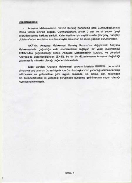 Bilgi notundaki değerlendirmede şöyle deniliyor: "AK Parti'nin, Anayasa Mahkemesi Kuruluş Kanunu'nu değiştirerek Anayasa Mahkemesi'nde çoğunluğu elde edebilmelerini sağlayan bir yasal düzenlemeyi TBMM'den geçirebileceği; ancak Anayasa Mahkemesi'nin kuruluşu ve görevleri Anayasa'da düzenlendiğinden (EK-D), bu tür düzenlemenin Anayasa değişikliği yapılması ile mümkün olacağı değerlendirilmektedir. Diğer yandan, Anayasa Mahkemesi Başkanı Mustafa Bumin'in de emekli olmasıyla boş bulunan üç asıl üyelik için Cumhurbaşkanı'nın yapacağı atamaların takip edilmesine ve gelişmelere göre uygun zamanda Sn. Genkur. Bşk. Tarafından Sn. Cumhurbaşkanı ile yapacağı görüşmede gündeme getirilmesinin uygun olacağı kıymetlendirilmektedir."