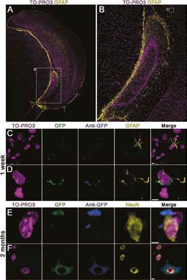 Resimde, GFP+ (işaretli anne) tarafından emzirilen yavruların immünohistokimyasal olarak boyanmış beyin bölümleri görülüyor. Anne sütüyle taşınan anne hücreleri, yavrunun beynine dağılır. (A,B) Beynin hipokampal bölgesindeki GFP+ hücrelerinin yakınlaştırılmış görüntüleri. (C–F) Glial hücre markörü (anti-GFAP) ve nöronal markör (anti-NeuN) farklı hücre tiplerini etiketlemek için kullanıldı, nükleer boya TO-PRO3 ile zıt boyandı. Nöronal ve glial hücrelere farklılaşan GFP+ hücreleri, bir hafta ve iki aylık emzirmeden sonra saptandı. (ölçek çubukları: 5 µm)