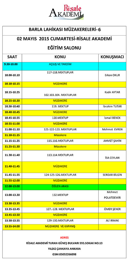 Risale Akademi'nin düzenlediği Barla Lahikası Müzakereleri devam ediyor. 2 Mayıs Cumartesi günü Akademinin Ankara'daki merkezinde düzenlenecek olan programda Barla Lahikasındaki mektuplar farklı isimler tarafından sunulacak ve müzakere edilecek.