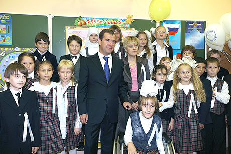 Başkent Moskova'nın Zamoskvoreçye bölgesindeki bulunan 518 nolu okulun açılış törenine katılan Medvedev, öğrencilere başarılar diledi. Engelli çocuklarla, sağlıklı çocukların birlikte eğitim aldıkları okulda Rusya lideri, öğrencilere hediyeler dağıttı.