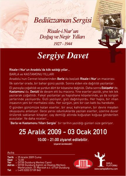 Çağdaş İslâm âlimlerinden Risale-i Nur Külliyatı Müellifi Bediüzzaman Said Nursî’nin hayatından (1927-1944) yıllarına ait önemli bir kesiti mercek altına alan ve o günlerden kalma belge ve hatıraları günümüze taşıyan Risale-i Nur’un Doğuş ve Neşir Yılları’nın anlatıldığı “Barla ve Kastamonu Yılları” sergisi 25 Aralık 2009 Cuma günü Duisburg’daki Diyanet İşleri Türk İslam Birliği Merkezinde açılıyor.