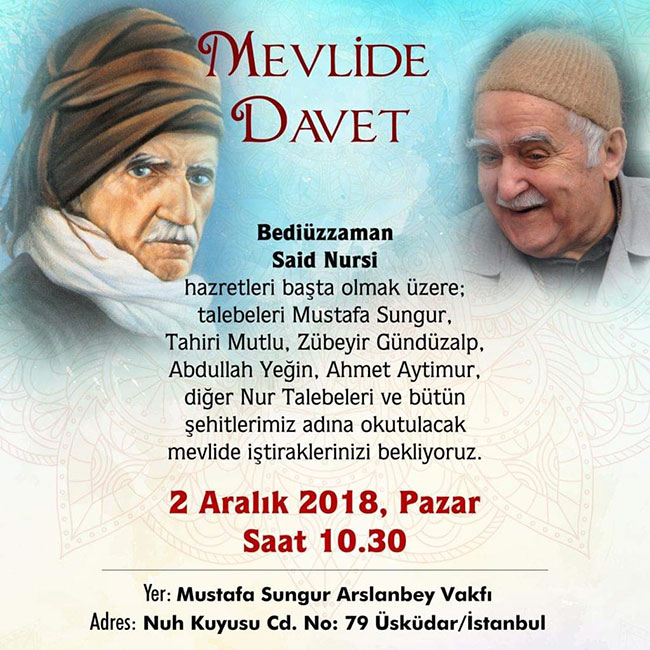 Bediüzzaman Said Nursi Hazretleri başta olmak üzere talebeleri Mustafa Sungur, Tahiri Mutlu, Zübeyir Gündüzalp, Abdullah Yeğin, Ahmet Aytimur ve diğer Nur talebeleri ve bütün şehitlerimiz adına mevlid okutulacak.