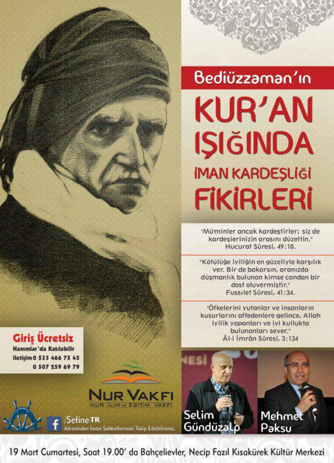 Nur İlim ve Eğitim Vakfı "Bediüzzaman'ın Kur'an Işığında İman Kardeşliği fikirleri" bir konferans düzenliyor.