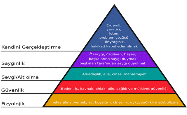 Maslow, insan ihtiyaçlarını, aşağıdaki şekilde de görüldüğü gibi, 5 kategoriye ayırmaktadır:
