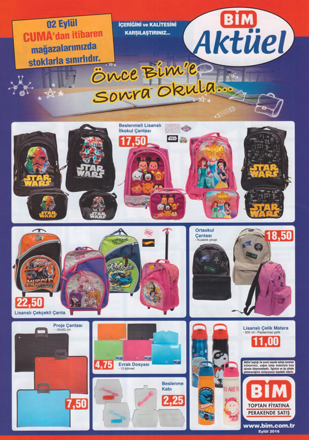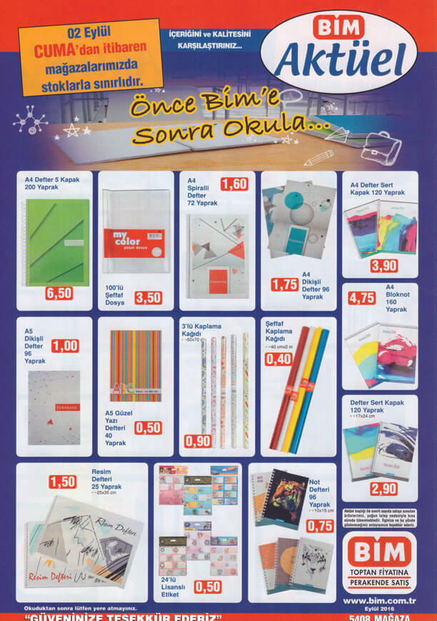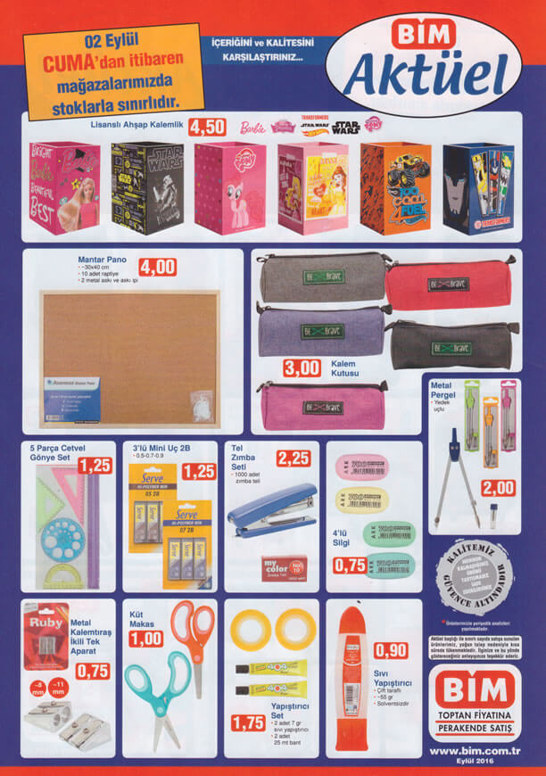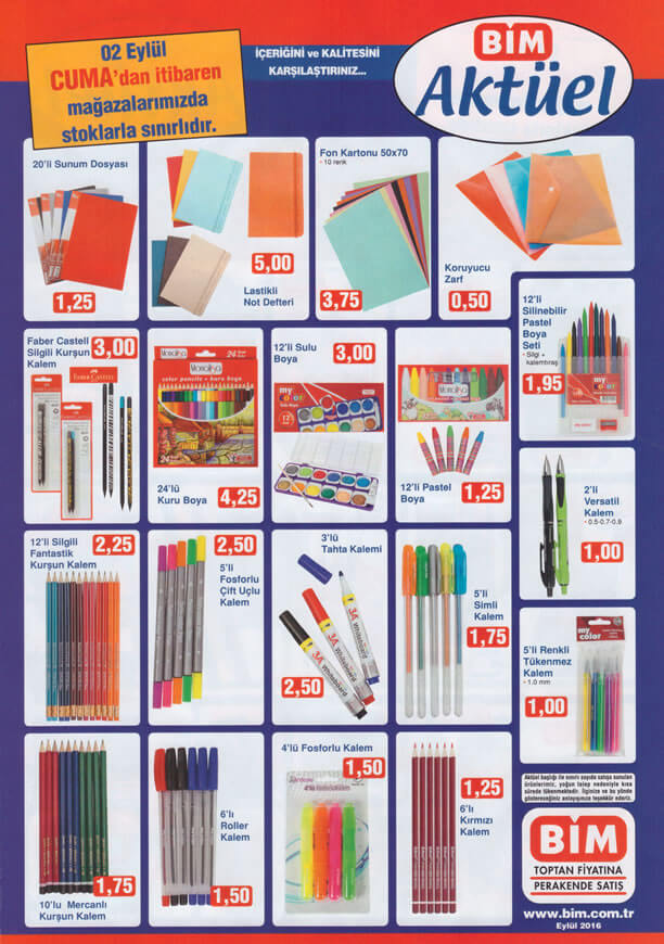 Hemen BİM Fırsat Ürünleri 2 Eylül 2016 Katalogu 2. broşür sayfasında yer alan okul eşyaları ve fiyatlarını listeleyelim;