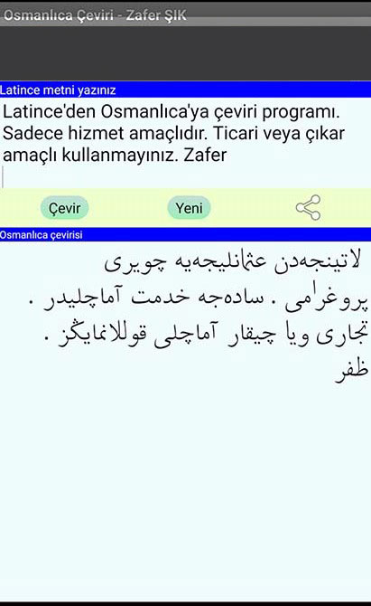 Zafer Şık imzasıyla yayınlanan “Osmanlıca Çeviri” programı Android 2.3 ve üzeri sistemlerde çalışıyor. Cihazınızda 3 mb gibi mütevazi bir yer kaplayacak bu program Osmanlıca çalışmalarınızda yardımcınız olacak. Ücretsiz olarak cihazınıza indirebileceğiniz uygulama, Android Uygulama kütüphanesine eklenmesinin üzerinden kısa bir süre geçmesine rağmen 1000’den fazla kişi tarafından kullanılmaya başlandı bile.