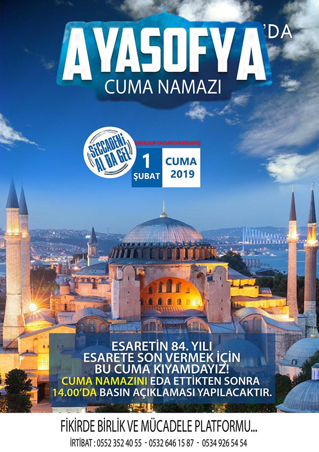 Fikirde Birlik ve Mücadele Platformu öncülüğünde 1 Şubat Cuma günü Ayasofya'da cuma namazı kılınacak. 'Seccadeni al da gel!' sloganıyla duyurulan cuma namazına yoğun katılımın olması bekleniyor.