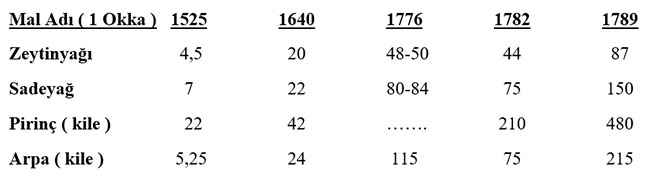 Osmanlı Dönemine baktığımızda fiyatlar genel düzeyinin son derece sâkin bir akış içinde cereyan ettiğini görüyoruz. Prof. Dr. Ahmet Tabakoğlu bu durumu şu örneklerle ifade eder: “1489-1617 yılları arasındaki 127 yıl içinde Edirne’de belli başlı gıda maddelerinin fiyatlarında yüzde 334,4’lük bir artış, İstanbul’da ise 1489-1606 arasından 116 senede yüzde 372,8’lik bir artış olmuştur. Bunların yıllık ortalamaları sırasıyla yüzde 1,2 ve yüzde 1,4’tür.” Tabakoğlu Hoca, bazı malların satış fiyatı olarak yıllar itibariyle şöyle rakamlar vererek fiyat artış seyrini bize sunar: (Rakamlar akçe olarak kaydedilmiştir.)