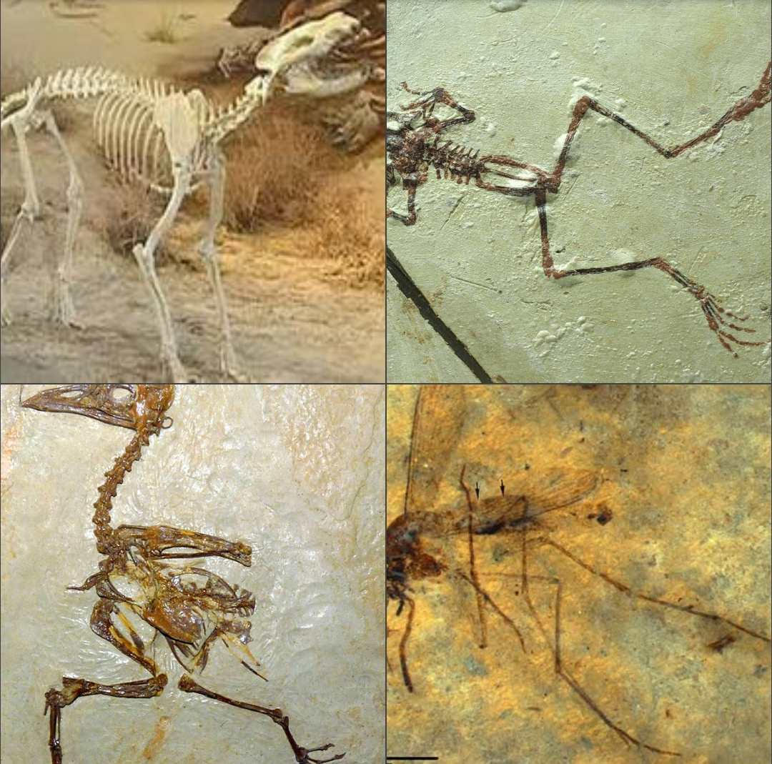 Fotoğraftaki köpek fosili 12 milyon yıl önceki bir köpeğe aittir. Ve bugünkü türünden farksız. Fotoğraftaki sivrisinek ve kurbağa ve ördek 60 milyon yıl evvel yaşamışlar... Yani hiç değişmemişler..!