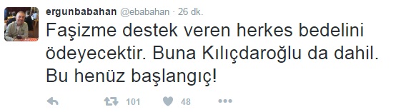 Babahan, Twitter'dan şu skandal sözleri sarf etti: "Faşizme destek veren herkes bedelini ödeyecektir. Buna Kılıçdaroğlu da dahil. Bu henüz başlangıç!"