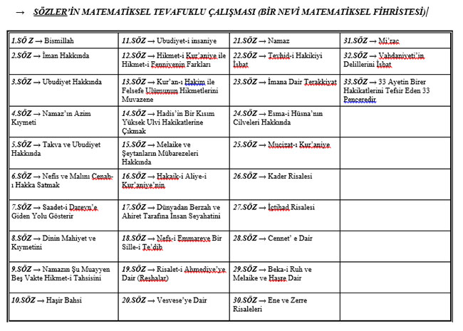 1-Birinci söz, 11. Onbirinci söz, 21. Yirmibirinci söz, 31. Otuzbirinci söz.