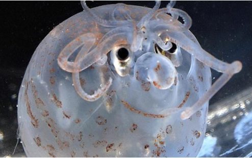Bu saydam yaratık, farklı pigmentlerin bir araya gelmesiyle böyle gülümsüyor gibi görünüyor.Catalina ve Los Angeles arasında görüntülenen bu sıradışı mürekkepbalığı, 'helicocranchia pfefferi' ismiyle biliniyor.