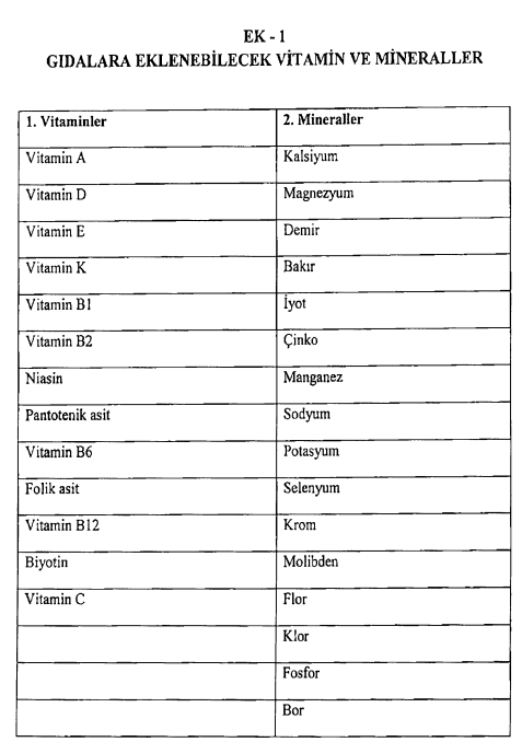 Gıda, Tarım ve Hayvancılık Bakanlığı tarafından hazırlanan Türk gıda kodeksi gıdalara vitaminler, mineraller ve belirli diğer öğelerin eklenmesi hakkındaki yönetmelik Resmi Gazete'de yayımlandı.