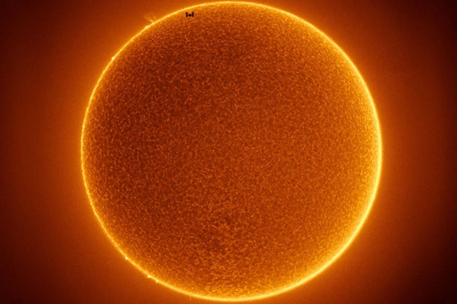 “Güneşle karşı karşıya kalmak ISS için olağandışı bir durum değil. Çünkü istasyon 90 dakikada bir dünyanın etrafında bir tur tamamlıyor. Karşılaşma sırasında ise doğru ekipmanlara sahip olunup bu fotoğrafın çekilebilmesi oldukça nadir bir durum. Garip bir şekilde fotoğraf çekildiği sırada hiç güneş lekesi bulunmuyordu. Fotoğraf iki fotoğrafın bir araya getirilmesinden oluşturuldu. Bu fotoğraflardan bir tanesi ISS Güneş'in karşısındayken çekilen bir fotoğraf diğeri de Güneş'in yüzeyinin detaylı bir fotoğrafı.”