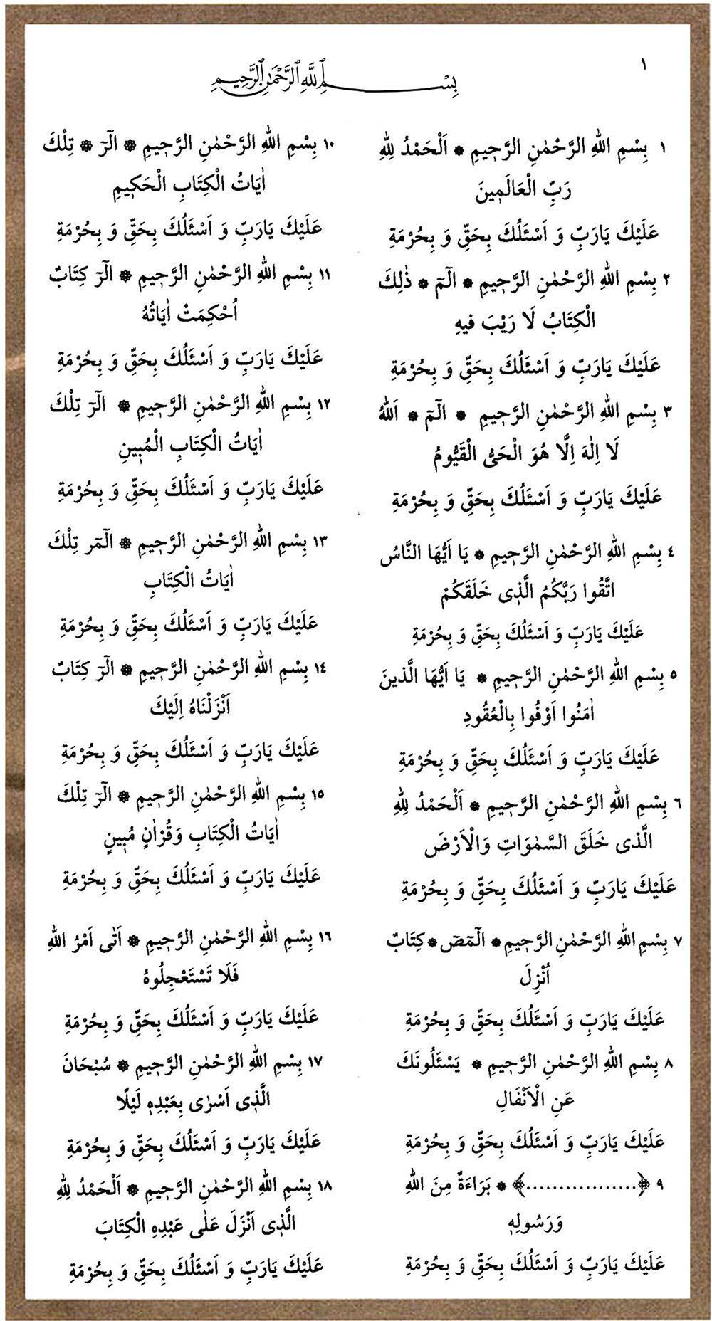 Kur’ân’ın yüz on dört sûresinin her birisinin ilk âyetlerini zikri içine alarak bu sûrelerin ve âyetlerinin şefaatleriyle Cenâb-ı Hak’tan af ve bağışlanma talebini içeriyor.