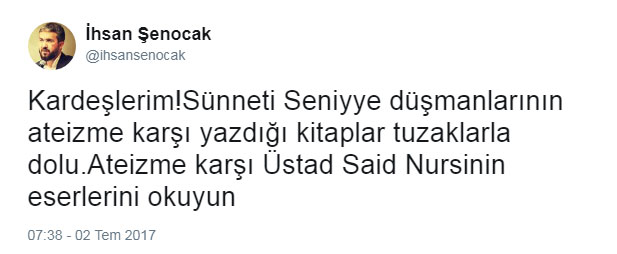 Sosyal medya hesabı twitter'dan görüşlerini paylaşan Dr. İhsan Şenocak hoca takipçilerine, "Kardeşlerim!Sünneti Seniyye düşmanlarının ateizme karşı yazdığı kitaplar tuzaklarla dolu. Ateizme karşı Üstad Said Nursinin eserlerini okuyun" avsiyesinde bulundu.