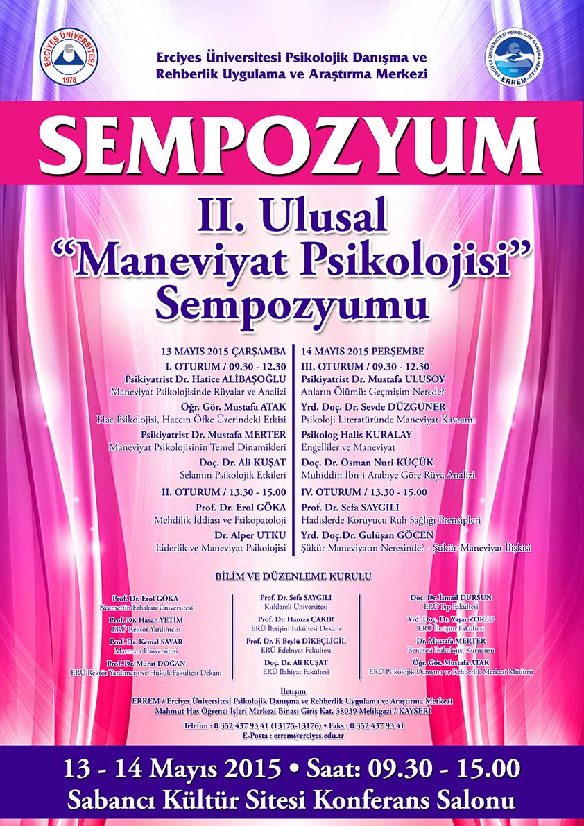 ERÜ Psikolojik Danışma ve Rehberlik Uygulama ve Araştırma Merkezi (ERREM) tarafından düzenlenen, Erciyes Üniversitesi Rektörlüğü tarafından desteklenen II. Ulusal Maneviyat Psikolojisi Sempozyumu Kayseri'de gerçekleştirilecek.