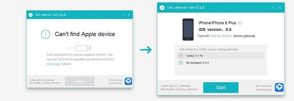Yukarıdaki işlemleri tamamladıktan sonra Taig programını açın ve iPhone veya iPad’inizi PC’ye bağlayın. Taig programında “3K Assistant” seçeneğindeki tiki kaldırın ve Start tuşuna basın.