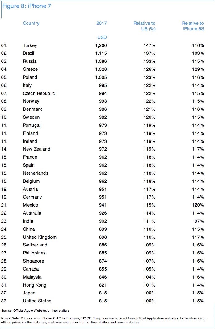 Böylelikle akıllı telefon satış fiyatlarında ülkeler arası uçurumlar oluşuyor. Bu farkın gözler önüne serilmesi için 33 ülke arasındaki fiyat farkları listelendi. Model olarak ABD’de 815 dolara satılan iPhone 7 128GB baz alındı.
