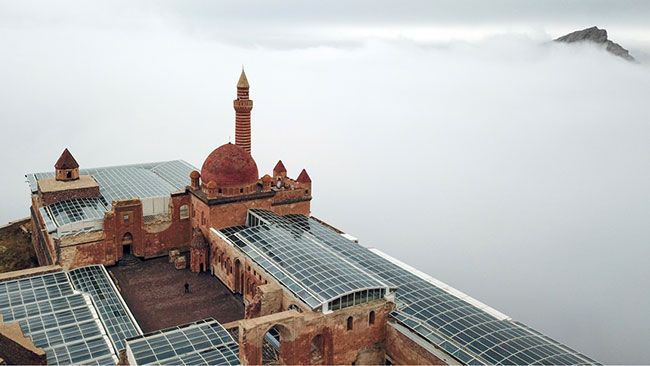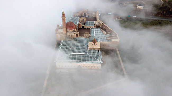 Türkiye'nin en doğusunda bulunan ve UNESCO Dünya Miras Geçici Listesi'nde yer alan İshak Paşa Sarayı, oluşan sis bulutu içinde muhteşem manzara sergiledi.