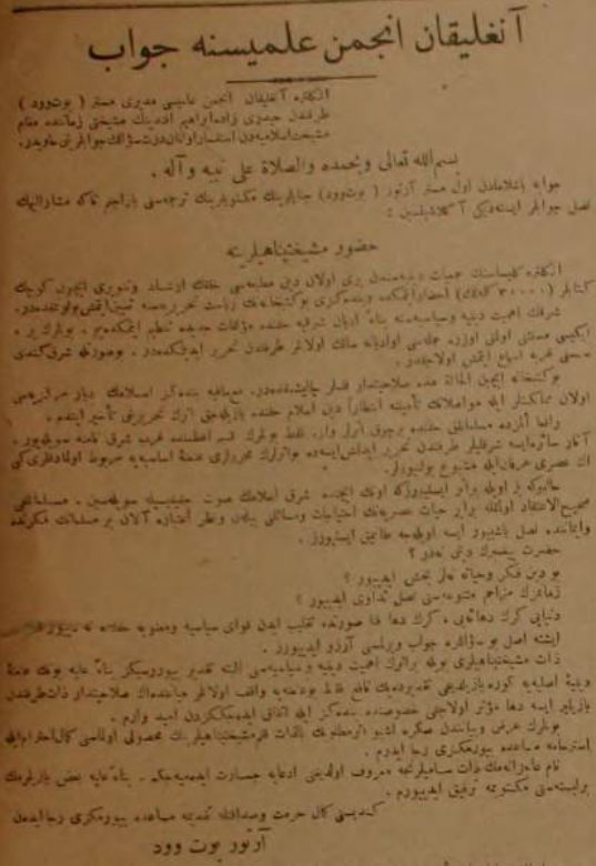 mezahim-i mütenevviası (çeşitli zulümleri) için çaresi nedir, şimdi cihanı daha iyi yahud daha fena bir hale getirmekde olan kuvva-yı siyasiyye ve maneviye hakkında diyeceği nedir? Cevap verilmiş görmesini isteyecek olduğum meseleler işte bunlardır. Zat-ı kudsiyyetmeâbınız böyle bir kitabın ehemmiyet-i diniye ve siyasiyesinin nasıl büyük olduğunu nazra-ı ûlâda (yüksek görüşlerinizle) temyiz edecek ve ümid ederim ki benimle birlikte şöyle düşünmeye muvafakat eyleyecekseniz ki, bu kitap asıl anane-i dîniye nazarından yazılırsa daha faideli olacak ve bu ananede salahiyetdar olan zat tarafından yazılırsa daha müessir olacaktır.