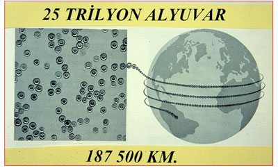 Gene sadece bir tek insandaki alyuvarları yani kanın kırmızı kürelerini yan yana bir zincir gibi dizebilse idik, takriben 187 500 km lik bir uzunluk meydana gelecekti. Bu ise dünyayı ekvatordan itibaren 4,5 def’a dolabilecek bir uzunluktur. Gene bir insandaki bütün alyuvarlar bir halı gibi zemine serilecek olsa idi, 3800 m2 lik bir sathı, yüzeyi kaplayabilmektedir. Bu ise aşağı yukarı dört dönümlük bir araziye eşdeğerdir. (Kahn F : The Human Body. Random House, New York, 1965, p.141.)