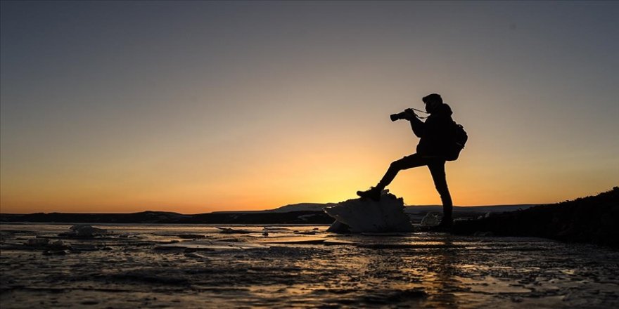 Gün batımı fotoğrafı çekmek için geldiğini belirten Dolapçı, "Havaların soğumasıyla gölün yüzeyi buzla kaplandı. Biz fotoğrafçılar da bu fırsatı değerlendirerek sık sık gelip burada fotoğraf çalışması yapıyoruz." dedi.