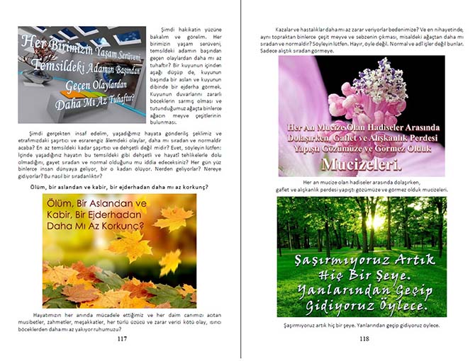 Görseller Hakkında: Konu anlatımlı şemalar, metin vurguları ve etkileyici resimlerden oluşan görseller, daha önce sunulan Keşif Yolculukları Risale-i Nur Eğitim Programı derslerimizin sunumlarından titizlikle alındı, geliştirildi ve kitap metni içine entegre edildi. Normalde 114 sayfa olan kitabımızın hacmi görsellerle 156 sayfaya çıktı. Kitabın ana metnine dahil olmayan 56 sayfalık ek bölümleri düştüğümüzde 58 sayfalık ana kitap metni, aynı hacme eşdeğer bir görsel içerikle takdim edilerek 106 sayfa’ya çıktı. Yani bu kitapta görsellik oranı %50! Bu gerçekten çok yüksek bir oran.