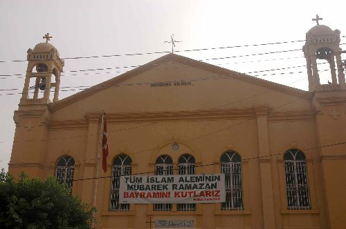 Hatay'ın İskenderun ilçesinde Hıristiyan Ortodokslar kilise duvarına astıkları pankartla Müslümanların Ramazan Bayramı'nı kutladı.