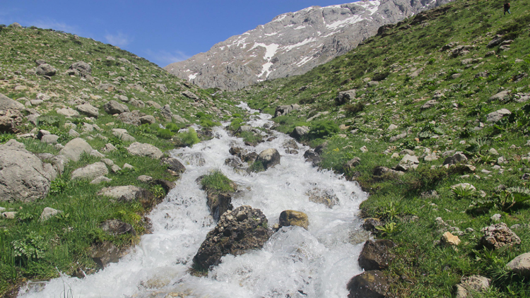 Kar manzarası eşliğinde şelaleleri gezip rengarenk çiçeklerle süslenen doğada hatıra fotoğrafı çektiren ziyaretçiler, bazı zamanlarda da bölgede ayı ve yaban keçileriyle karşılaşarak farklı heyecan yaşıyor.