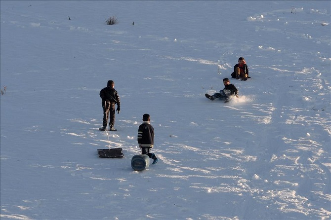 Van'ın Gevaş ilçesine bağlı Gündoğan Mahallesi'nde, boş vakitleri fırsata dönüştüren çocuklar karlı tepelerde kayak yapıyorlar. Havanın güzel olduğu günlerde, evlerinden getirdikleri bidon ve metal tepsilerle mahalle yakınındaki tepelere çıkan çocuklar, burada üstüne bindikleri bidon ve tepsilerle kendilerini yamaçtan aşağı bırakıyor. Aşağıya kadar riskli bir yolculuk gerçekleştiren çocuklar, zaman zaman düşseler de keyifli anlar yaşıyor. (Özkan Bilgin - Anadolu Ajansı)