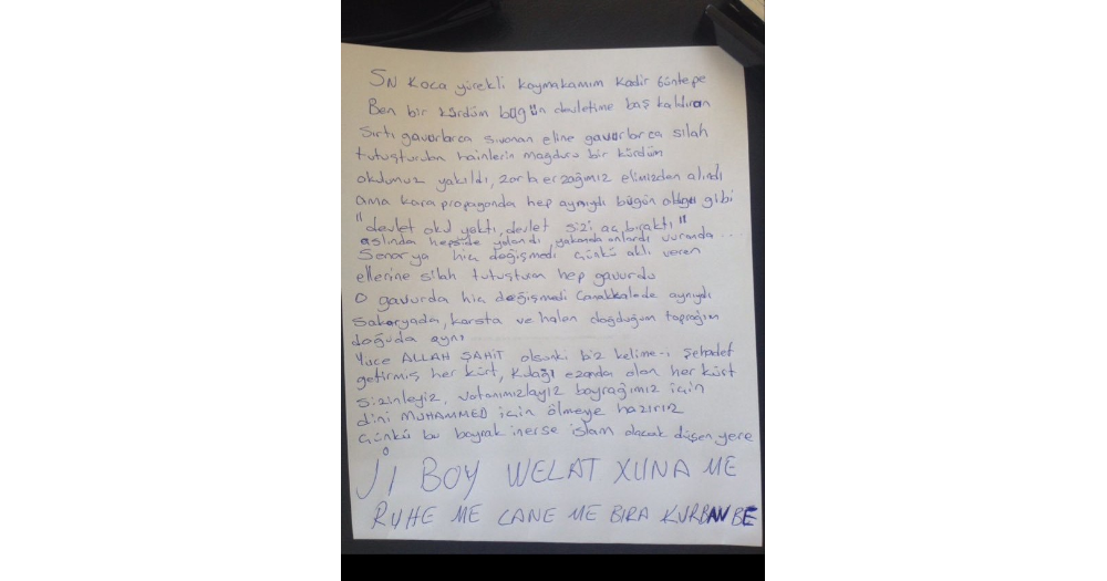 “Sayın koca yürekli kaymakamım Kadir Güntepe. Ben bir Kürdüm, bugün devletime başkaldıran, sırtı gavurlarca sıvanan, eline gavurlarca silah tutuşturulan hainlerin mağduru bir Kürdüm. Okulumuz yakıldı, zorla erzağımız elimizden alındı, ama kara propaganda hep aynıydı, bugün olduğu gibi. ‘Devlet okul yaktı, devlet sizi aç bıraktı’. Aslında hepsi de yalandı, yakan da onlardı, vuran da. Senaryo hiç değişmedi, çünkü aklı veren, ellerine silah tutuşturan hep gavurdu. O gavur da hiç değişmedi, Çanakkale’de aynıydı, Sakarya’da, Kars’ta ve halan doğduğum toprağım doğuda aynı. Yüce Allah şahit olsun ki, biz kelime-i şehadet getirmiş her Kürt, kulağı ezanda olan her Kürt sizinleyiz, vatanımızlayız, bayrağımız için dini Muhammed için ölmeye hazırız. Çünkü bu bayrak inerse, İslam olacak düşen yere. Ji boy welat Xuna Me. Ruhe Me, can eme, bırak urba be”.