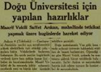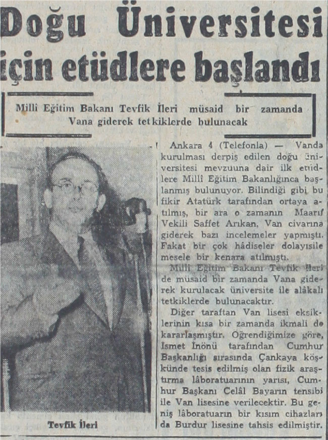 Demokrat Parti iktidara geldikten sonra, tek parti zihniyetinin girişmiş olduğu; fakat bir türlü başaramadığı Van’da üniversite kurma çalışmalarını, tam tamına haber kupürlerinden de görüleceği üzere on üç sene sonra başlatmıştır. Bu olayı haberleştiren 5 Kasım 1950 tarihli Cumhuriyet gazetesi haberi” Doğu üniversitesi için etütlere başlandı Milli Eğitim Bakanı Tevfik İleri müsait bir zamanda Van’a giderek tetkiklerde bulunacak. Tevfik İleri Van’da kurulması derpiş edilen doğu üniversitesi mevzuuna dair ilk etütlere Millî Eğitim Bakanlığımca başlanmış bulunuyor.” diye vermiştir.