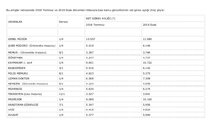 Hazine ve Maliye Bakanlığınca, enflasyon oranından kaynaklı olarak ilave yüzde 6,73 artış ile birlikte kamu görevlileri ile memur emeklilerinin aylık ve ücretlerinde ocak ayından geçerli olmak üzere toplamda yüzde 10,73 artış yapıldığı belirtilerek, bu çerçevede aile yardımı ödeneği dahil en düşük memur maaşının 3 bin 512 liraya, en düşük memur emekli aylığının da 2 bin 379 liraya yükseldiği bildirildi.