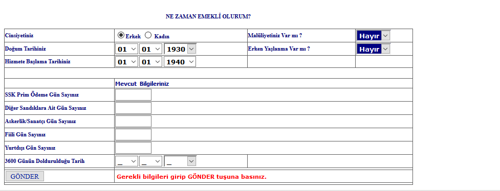 Emeklilik tarihinizin doğru şekilde hesaplanması için, linki tıkladıktan sonra yukarda resimli örneğini verdiğimiz alanları doğru olarak doldurmanız gereklidir.