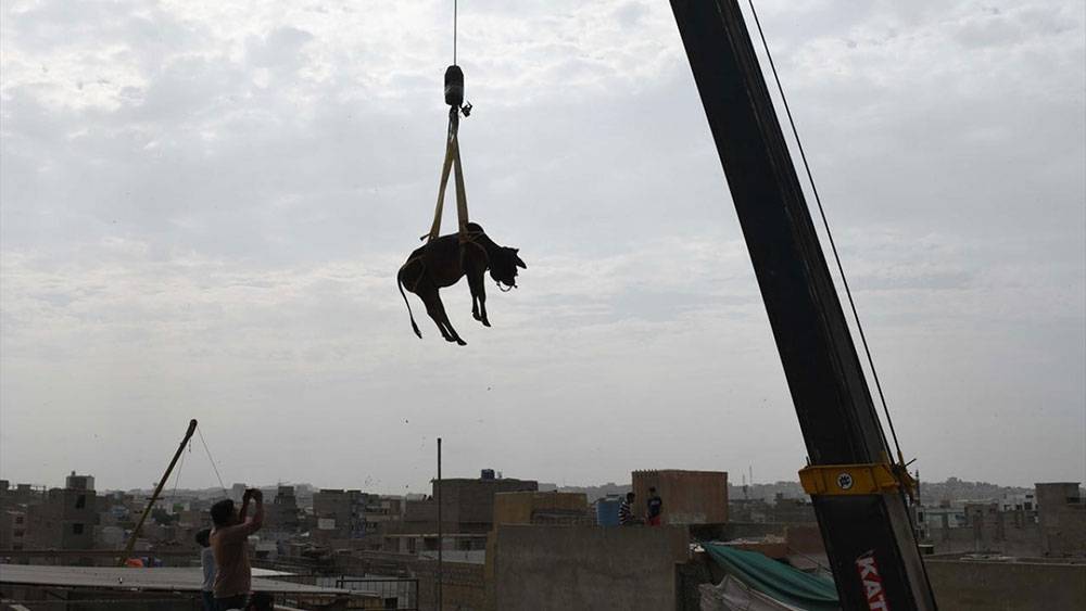 Pakistan'ın Karaçi kentinde bazı besiciler, Kurban Bayramı öncesi evlerin çatısında besledikleri kurbanlıklarını vinç yardımı ile indirerek kurban pazarına götürüyor. Ülkenin en kalabalık kenti olan Karaçi'de çarpık yapılaşma ve tarım arazilerinin yetersizliği nedeniyle bazı Pakistanlılar, yıl içerisinde evlerinin çatılarında besledikleri kurbanlıkları daha sonra vinçlerle indirerek satıyor. (Sabir Mazhar - Anadolu Ajansı)